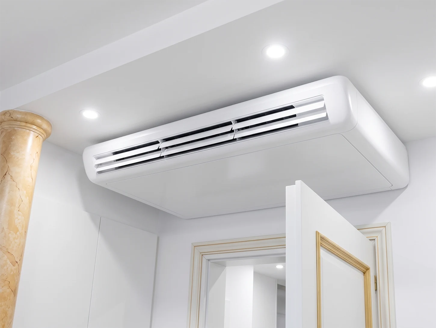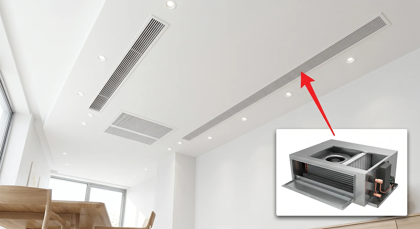 Внутрішній блок канального кондиціонера врізається в канал – систему повітроводів. Він прихований за фальшстелею, підготовлене повітря подається в приміщення через повітророзподільні пристрої. Для його монтажу потрібен розрахунок діаметра (перерізу) повітроводів, щоб повітря рухалося ними з оптимальною швидкістю, не створюючи надмірного шуму.