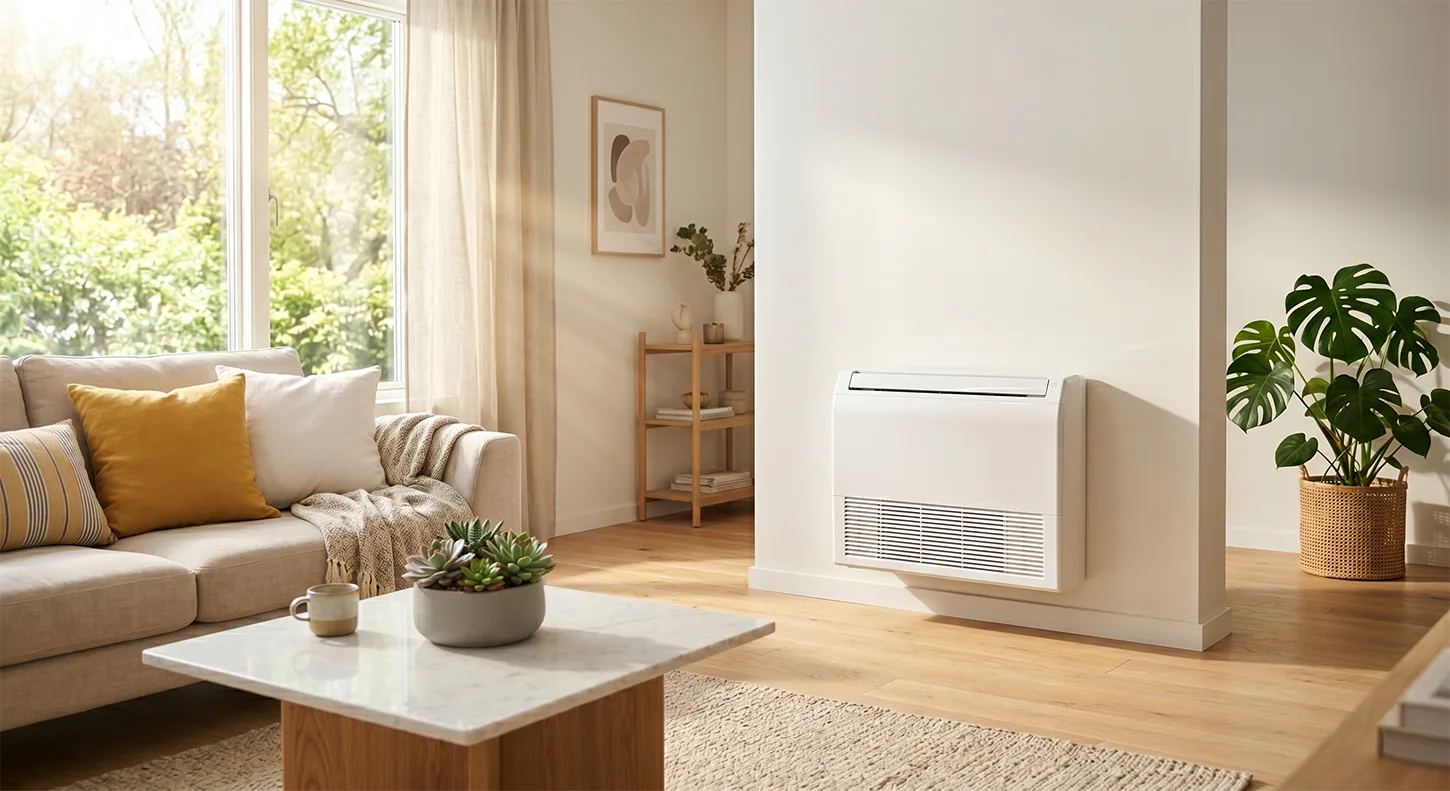 Внутрішній блок підлогової спліт-системи потрібно встановлювати внизу стіни на висоті не менше ніж 10 см від підлоги, щоб забезпечити можливість стікання дренажних вод.